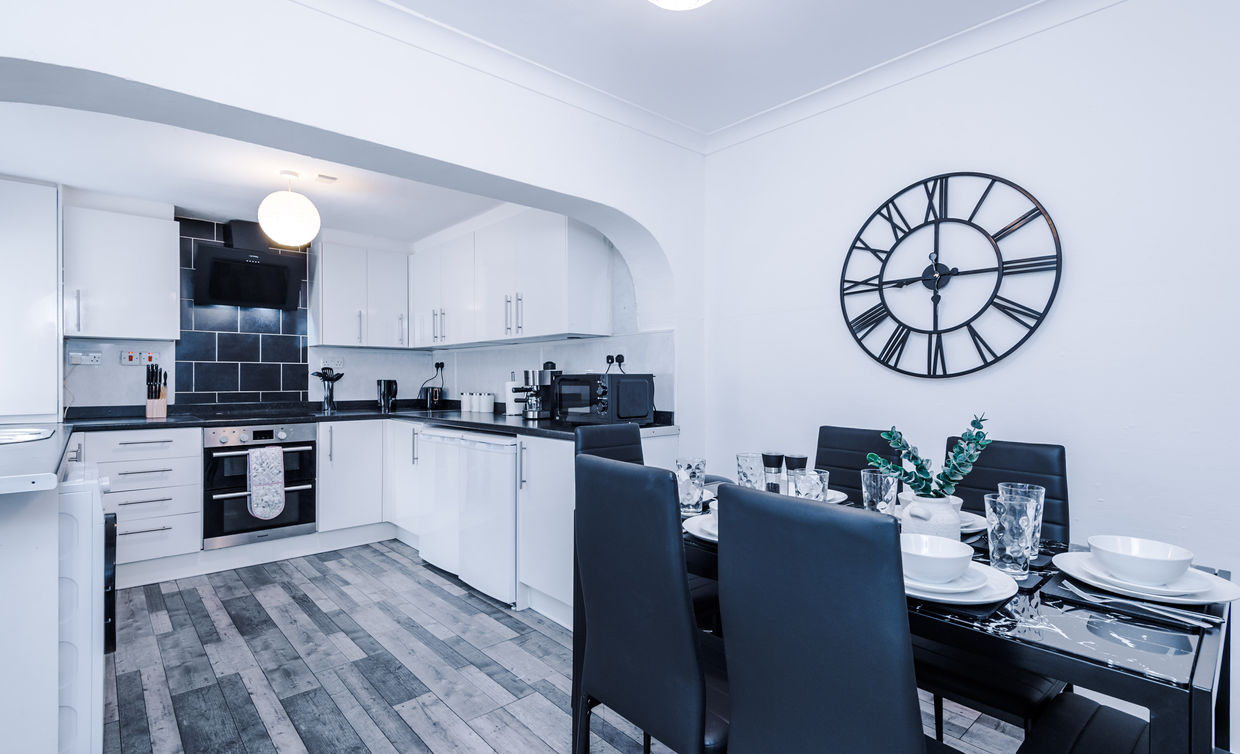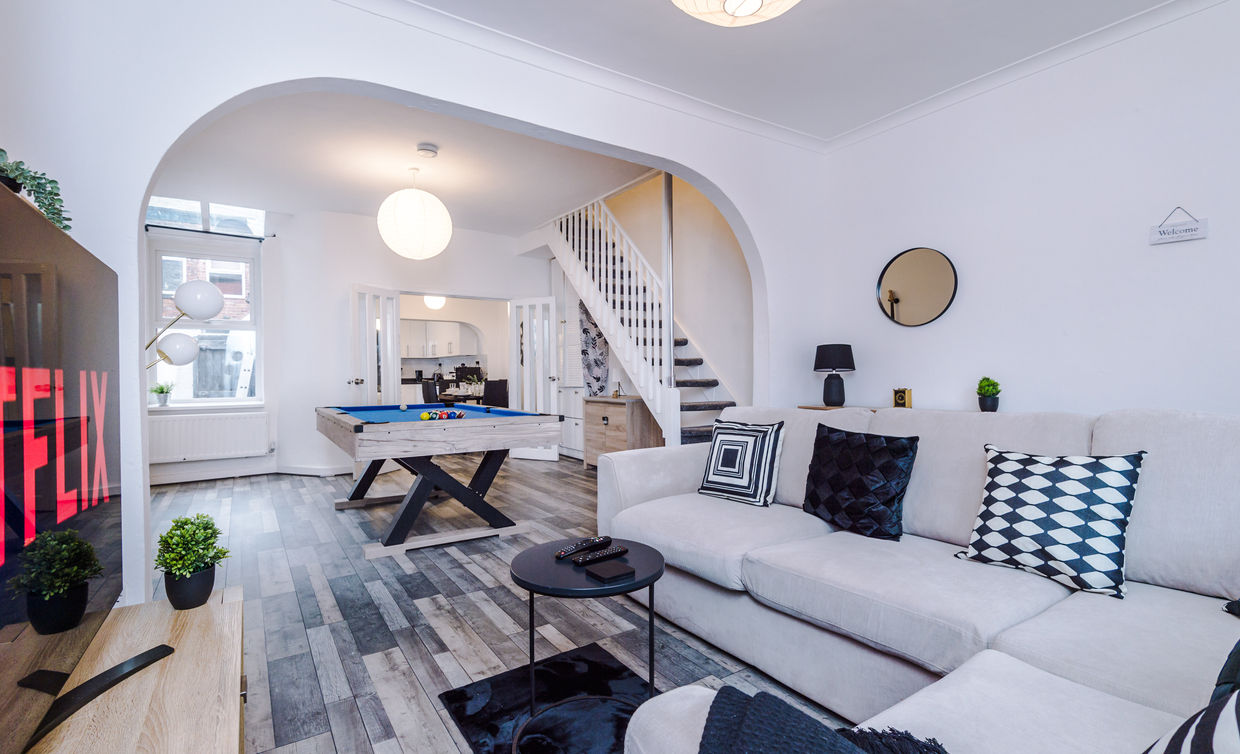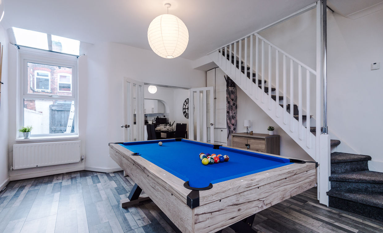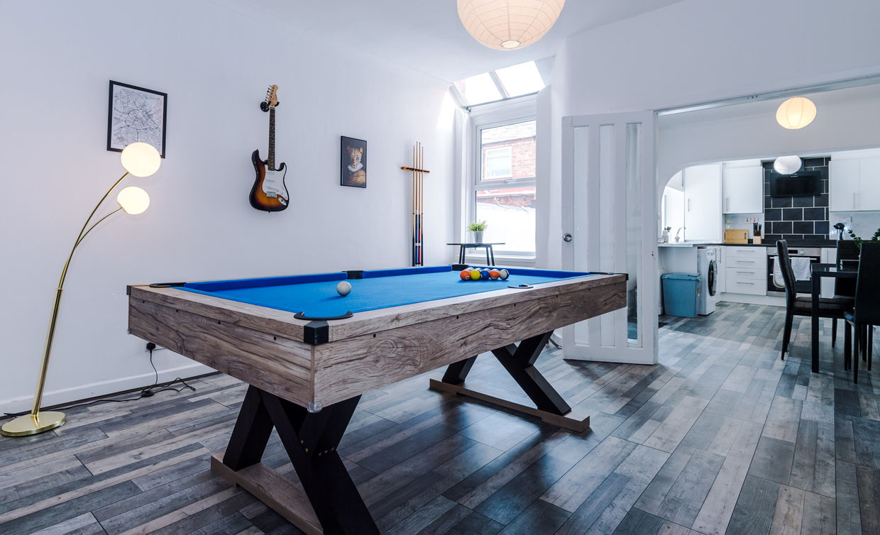 Modern and newly refurbished 3-bedroom home just 8 minutes from Manchester City Centre. Guests love the 7ft pool table, 55" HDTV with Netflix, high-speed Wi-Fi, and quiet cul-de-sac location. The property features a fully equipped kitchen, spacious lounge, and BBQ area perfect for relaxing evenings. Surrounded by local pubs, shops, and restaurants within a minute’s walk, it’s ideal for families, groups, and business travellers seeking comfort, convenience, and great value stays.